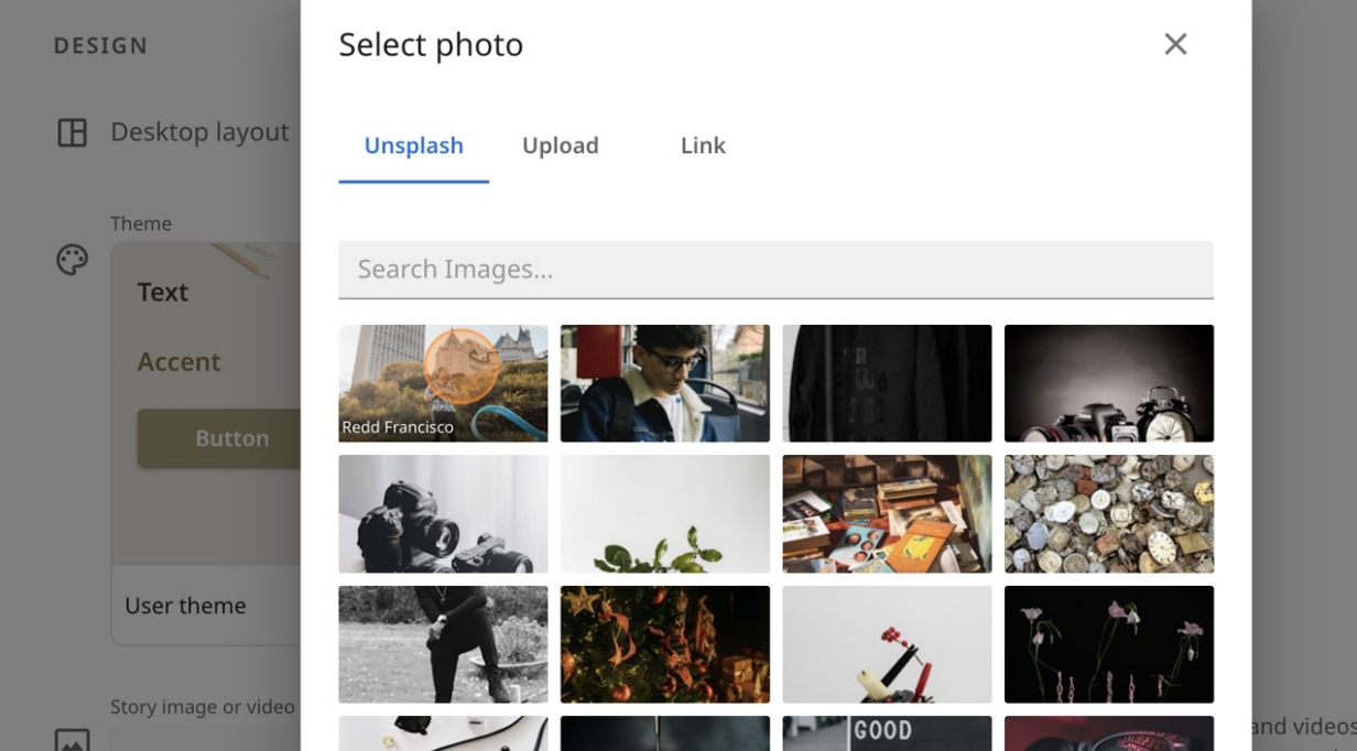 3. Select an image from the Unsplash gallery, or upload your own image.